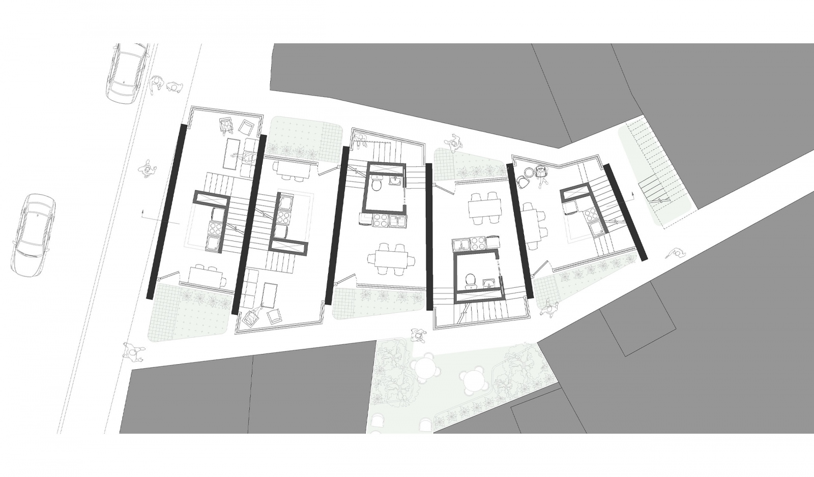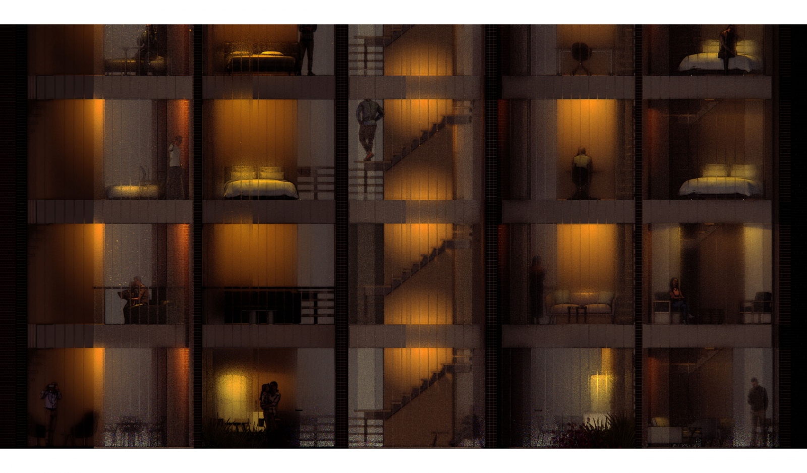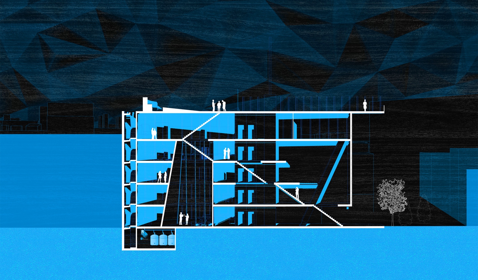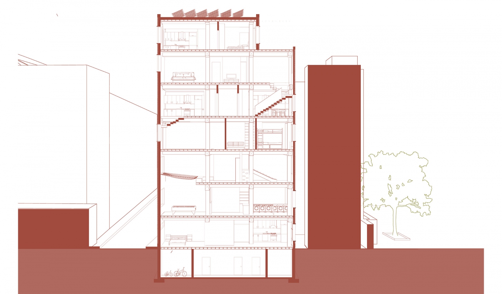 Because of the unusual nature of the seven sites chosen for the studio, the idea of a Sliver Building, which is extremely long and thin and much taller than it is wide, becomes a fascinating typology to explore. Sliver Buildings challenge conventions of existing prototypes due to the pecular conditions of each site and their funky proportions. Every element – a stair, door, hallway, or a window – holds an elevated level of importance and challenges typical architectural conventions of proportion and composition to gain access to natural light. The section becomes the key driver in organizing the space in between the front and back walls, with sidewalls that are often opaque. These are often buildings without corridors, but rather nested geometries of stairs and a series of contingent spaces that spill both horizontally and vertically through the void in the urban form to harness natural light.