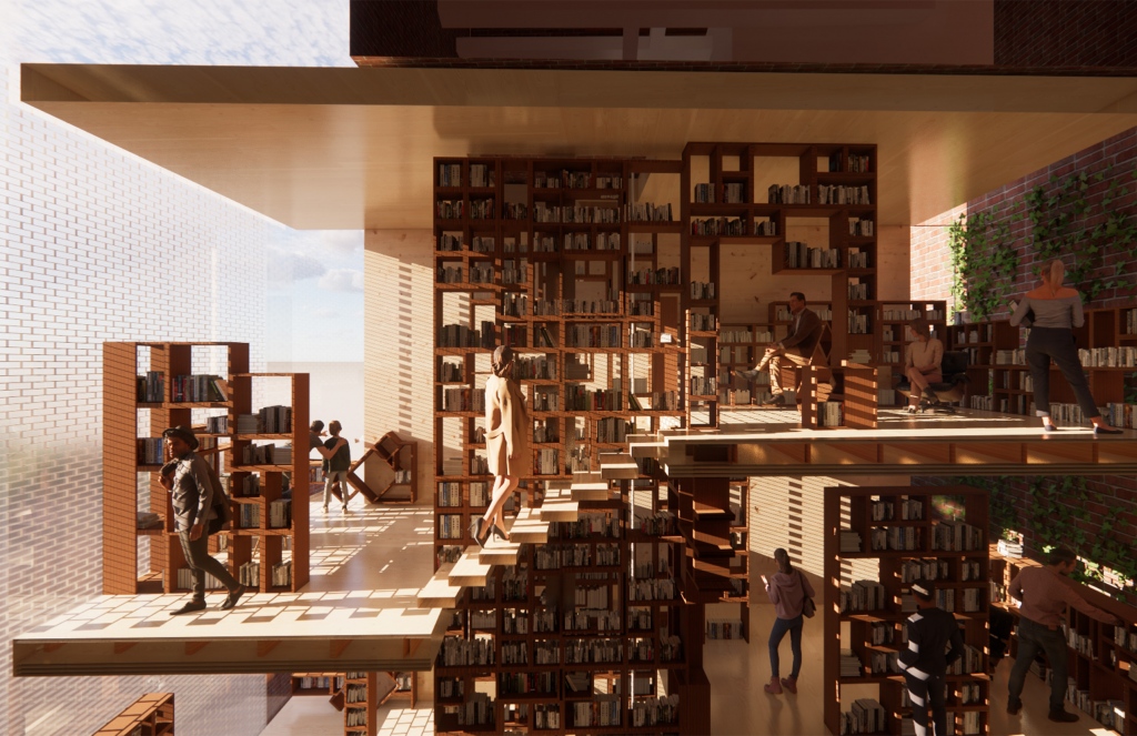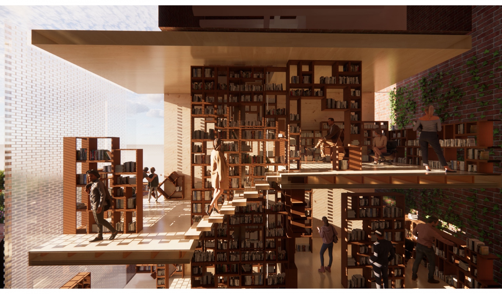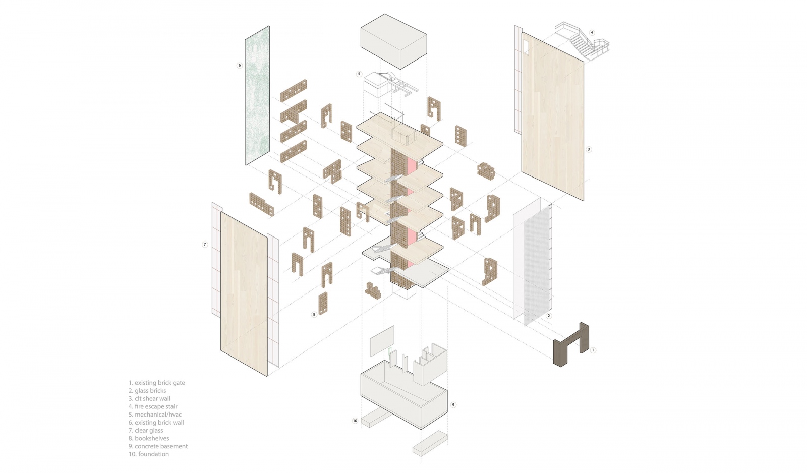 The design of this community library uses the bookshelves–a vital aspect of any library–to create a modular solution to the design of the interior. Cross-Laminated Timber (CLT) brings a natural warmth and comforting feeling from the exposed material while providing strength to the building. Utilizing the existing brick gate that frames the front façade, the glass brick that rests above recontextualizes the heavy brick surroundings to create a veil-like, translucent window into the interior. Clear glass is introduced on the exterior at alleyway view corridors so passerby can easily look within. These clear views invite people to discover the cohesive and collaborative space created inside which encourages greater engagement with all patrons of the new library.