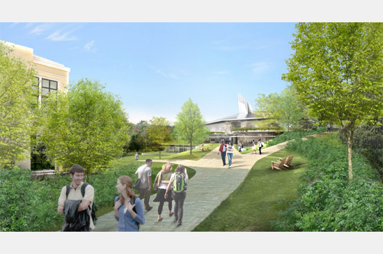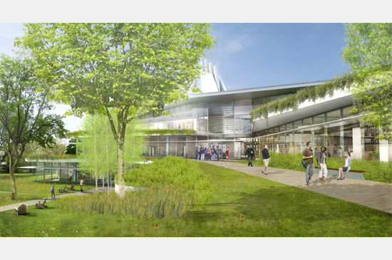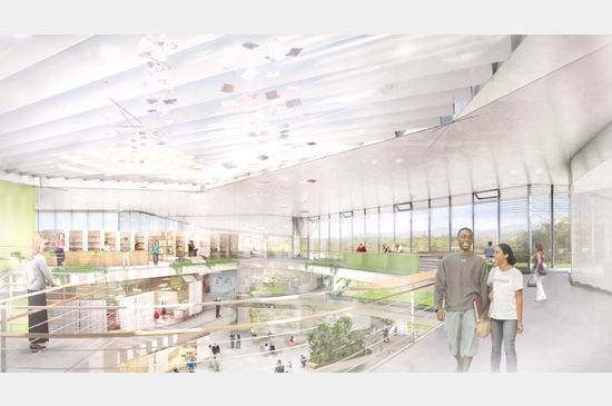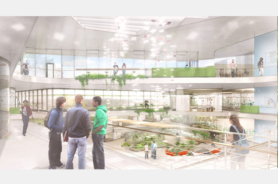 This month we’re looking at Amherst College’s New Science Center, a collaboration project with Behnisch Architekten. This building is a 255,000 GSF multidisciplinary science building housing the College’s biology, chemistry, physics, and psychology departments. Research and teaching labs, along with support facilities, classrooms and informal learning spaces are all organized around a large multistory atrium, physically and visually connecting the sciences. Though still in the design phase, the New Science Center aims to be a sustainable building, as defined by reduced consumption of energy and limiting environmental impact both during and after construction.