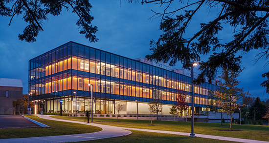 The Science Center was built on an existing parking lot, and is currently tracking LEED Gold. A glazed corridor wraps the building as a “blanket,” which acts as a thermal buffer, allowing solar heat gains to assist during the heating season, which is when the building is used most. A narrow footprint allows much of the building to be daylit, and internal automated blinds mitigate any discomfort due to glare.