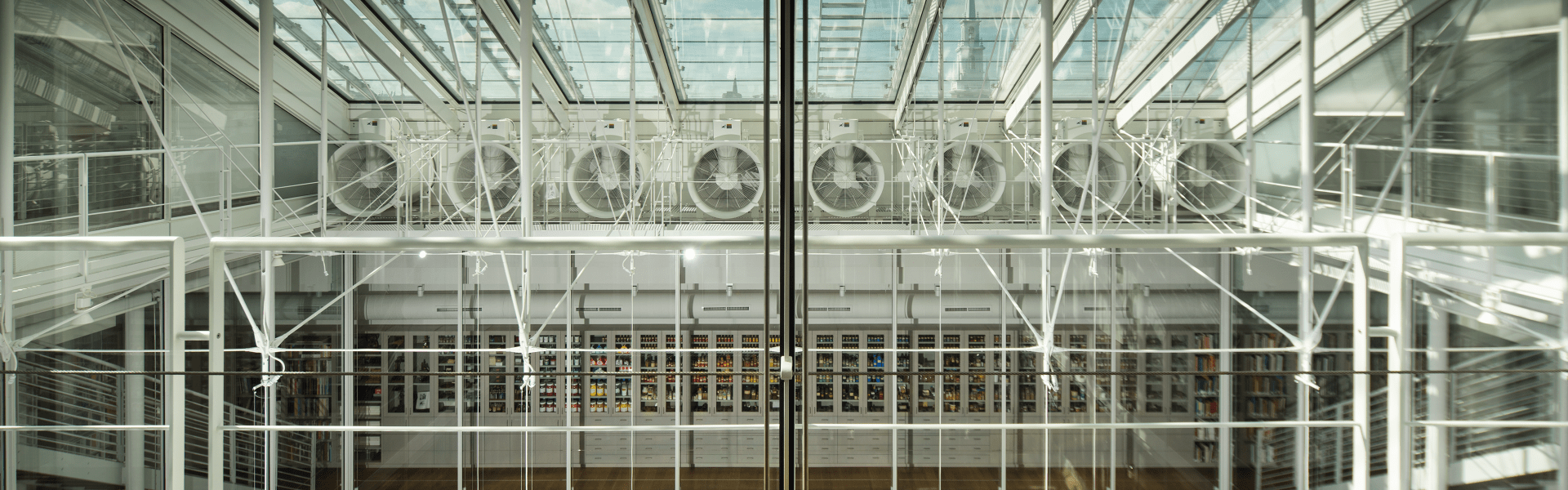 Perhaps the most innovative energy management strategy, however, is the design of the glass roof system dubbed the “light machine.” This sloped glazing system knits together the new and historic construction, bringing natural light deep into the building. It uses triple-paned insulating glass units to minimize heat loss, while maximizing natural light at the upper floors and at the central courtyard. Two shade systems (one exterior and one interior) control solar gain to further improve energy performance and facilitate maintenance of closely controlled environmental conditions. The shades also allow for fine tuning of the quality and magnitude of natural lighting in the conservation laboratories located on the upper floors of the building.
