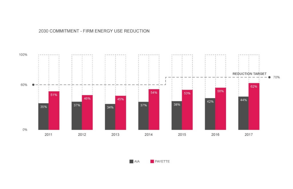 In 2017, the AIA reported an average reduction of 44% in the predicted energy-use intensity from all firms contributing data. PAYETTE’s average reduction is 62% pEUI savings- our best year yet. We had 4 large projects meet the 70% target, and 3 additional projects came very close as well. PAYETTE is proud to exceed the average reduction of all the firms reporting for the commitment every year, but we still have room for improve for all of our projects to meet the 70% goal by 2020, and the ultimate goal of carbon neutral by 2030.