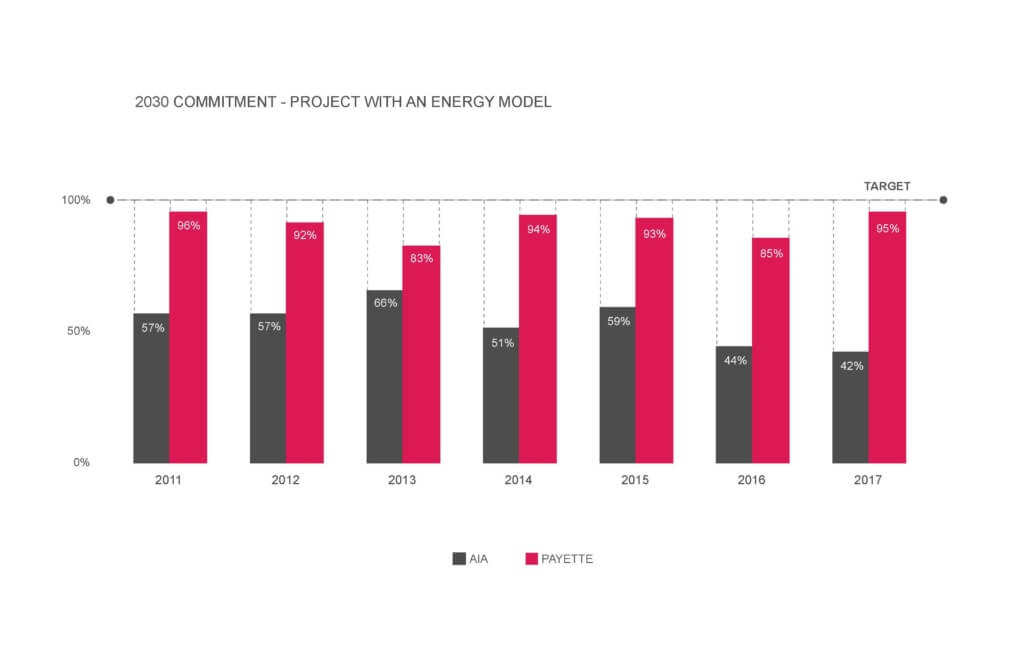 PAYETTE has set a goal of having an energy model for all of our projects, and we have met that goal for 95% of our projects last year, far exceeding the average of all reporting firms of 42% of projects with energy models. Additionally a number of our projects will collect operational energy, allowing us to compare actual energy usage to the initial design targets and further improve our projects going forward.