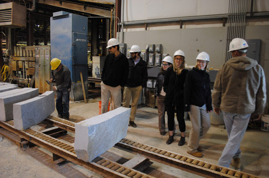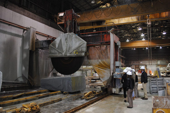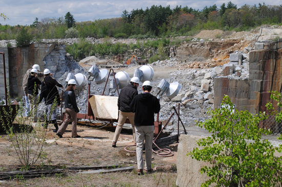 PAYETTE’s Young Designer’s Core traveled to the Granites of America (GOA) quarry and facilities on April 24, 2012 in Westford, MA. Highlights of the trip included a tour of the large shop facility where diamond-blade cutting machines and large radial saws are used amongst a variety of other machines for finishing and sculpting the Chelmsford granite that is extracted from the quarry just across the street.