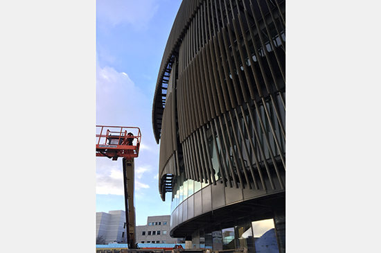 If you are in Boston, you can closely follow along with the construction progress of one of our latest projects, the new Interdisciplinary Science and Engineering Complex (ISEC) at Northeastern University. Just this month PAYETTE’s Young Designer Core (YDC) organized a tour to check out the construction progress since their most recent tour in October when installation of the unitized curtain panels had just begun. The unitized façade was completed in January and since then we’ve seen progress on the exterior catwalk and sunshades.