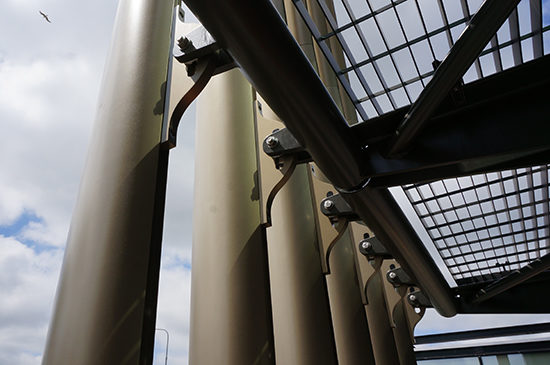 The tour started outside with Wes Schwartz and Rishi Nandi summarizing the fabrication of the custom fins manufactured by Permasteelisa in the Netherlands. Each fin is unique from the next in length and angle requiring careful labelling in the process of installation. The fins are then pieced together and supported by the catwalks.