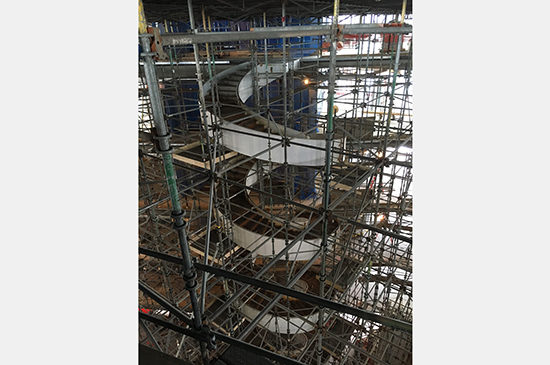 Descending further, scaffolding fills the central atrium and interior curtainwall panels enclose the form of the building. Programmatically, the offices of the complex are located along the faceted curve form requiring the doors to be placed attentively in order to coordinate with the interior curvature. Because of its curved nature, the same challenge is seen throughout the building. The teaching labs, for example, will have sliding glass doors and therefore require even more precision. However, with meticulous coordination, the glass interior will become a feature that fosters curiosity and collaboration. Structural work is complete on the iconic spiral staircase and awaits a custom glass railing that will be installed seamlessly. The project is moving along quickly as lower floors have sheetrock and drywall already in some rooms. Excitement builds while the complex comes together.