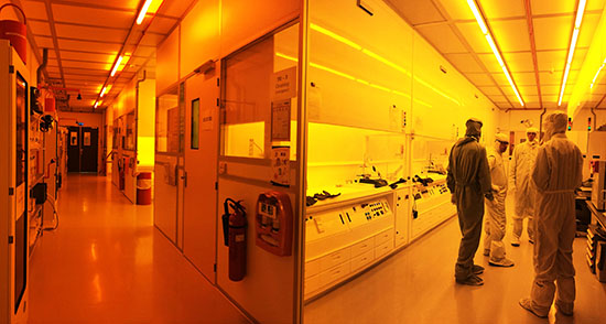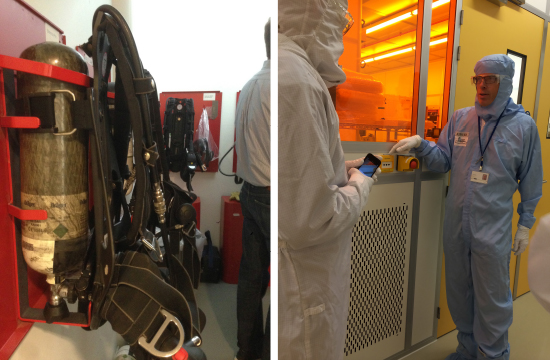 The clean space itself is full of specialized equipment and specialized hazards. Some rooms must have yellow lighting to prevent ultraviolet radiation from prematurely exposing photolithographic processes; all the rooms have gas sensors designed for each gas in use, plus manual panic buttons. If the alarms are triggered, the three full-time cleanroom staff in the control room have breathing gear to enter the space for rescue operations.