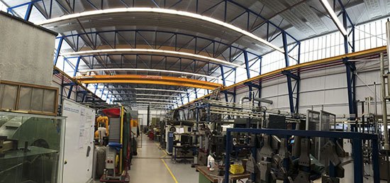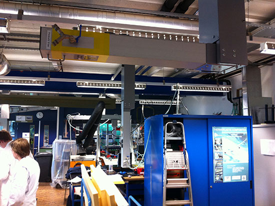 At the opposite end of the manufacturing scale (and the other end of campus), we visited the Aerospace Structures and Materials Laboratory – an enormous hanger, 25 meters wide and 75 meters long, with a five-ton overhead traveling crane 10 meters above. The entire hanger is filled with materials research and manufacturing equipment, from carbon-fiber wrapping machines to huge metal presses and computer-controlled milling machines. One part of the hanger is screened off for indoor testing of small drones.