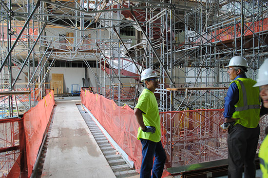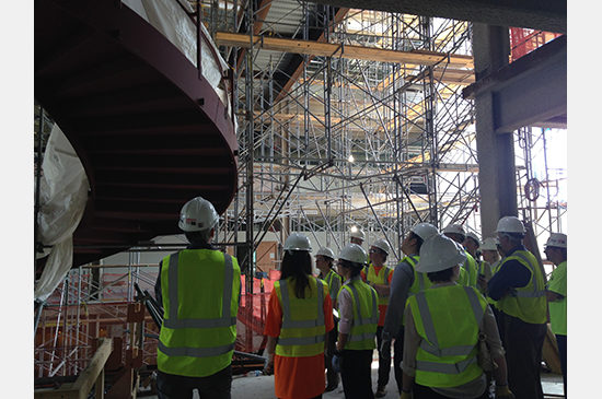 The tour was a great opportunity for us to see the building in different stages of construction. Scaffolding filled the atrium in preparation for the installation of rafters and the atrium skylight. The steel structure for the spiral stair was in place, with each of the three flights weighing 11,000 lbs. The tour concluded with the group getting a view of the project from Roger Street Park.
