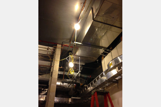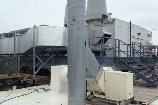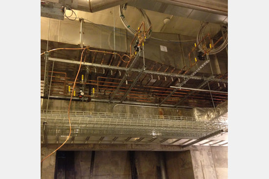 The technical requirements for containment and safety are a major element of the facility. The enclosure of the cyclotron and the hot cells are both lead shielded for protection against radiation exposure and the cyclotron is also self-shielded. Additionally, there are stringent environmental requirements regarding temperature, humidity, particulates and air changes. To accommodate these requirements, a new mechanical penthouse is located on the roof, eight floors above the cyclotron, and the exhaust system has lead shielded units and nuclear grade air filters. To get large exhaust ductwork to the roof of the Drydock Center, a defunct freight elevator shaft (large enough to transport a US Army Jeep) was repurposed with new mechanical risers to the exhaust fans on the roof.