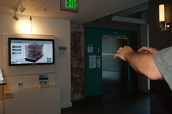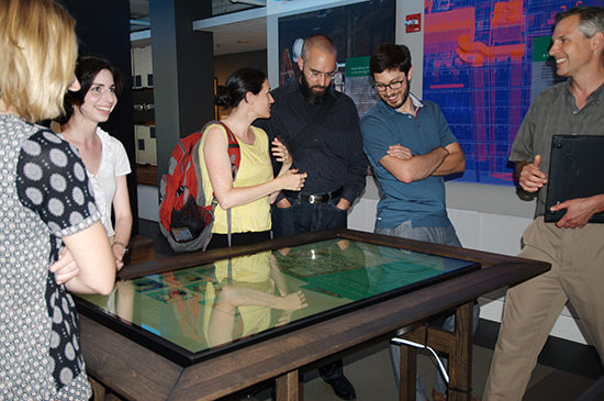 Outgrowing their previous location, in 2013 the CSE transformed a 100-year-old, pigeon-filled warehouse into the Building Technology Showcase (BTS). The retrofit incorporates a variety of sustainable material and systems that are actively monitored, to showcase the CSE’s mission and provide instantaneous performance feedback. A number of interactive displays show staff and guests how the building is running at all times. Several wall and floor areas had transparent panels to display the pipes and valves for hydronic systems. Many of the systems were installed by partner companies as a testing ground. For example, Thyssen Krupp provided the “Synergy Elevator” which incorporates several energy saving features. We had fun trying out the 3D motion-controlled screen to explore a model of the building and its systems (and we agreed it was still in the development stage!).