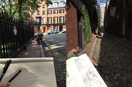 The event started at the Massachusetts State House next to the Common with a quick warm up sketch; most of drawings focused on the geometries and proportions of the façade. From here, the group set off to Louisburg Square and Acorn Street to study the early 19th century Federal Style brownstones and Charles Bulfinch’s urban planning. From there we proceeded over the hill to the North Slope, which was formerly considered part of the mostly demolished old West End neighborhood. The ornamented tenements and narrow alleys contrasted the town houses on the South Slope and provided many opportunities for sketching details. We finished the afternoon on the rooftops of Revere Street to admire Beacon Hill and the rest of the city from above.