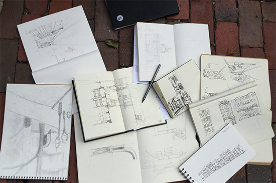 One of the most difficult aspects to deal with when sketching on site is TIME. It is crucial then, to plan ahead and quickly understand the major elements of the space, what drawing types and styles you should use to best represent it, and ultimately what you’re most interested in documenting. Knowing at least two out of these three components will inform the third and more clearly define what is necessary to the sketch, what can be left out, and how much time you will need. This approach places an emphasis on editing what you see, how you draw it and will help produce a sketch that makes a statement.
