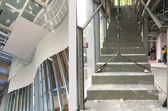 Left: Colloquium Curved Wall. Right: Communicating Stair with rigging chain still attached.