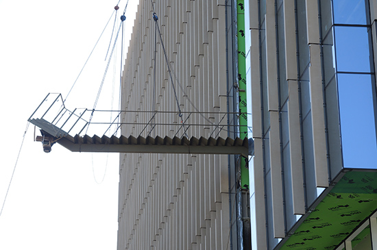 The unitized Fibre C panel curtain wall is mostly complete on the North and West facades and about 90% complete on the East and South. The group then made their way to the fourth floor which is the most completed level and where the drywall is up. The massive single-piece communicating stairs are also in. These tremendous pieces were hoisted up and rigged in through the vertical notch in the building. All the stairs have been delivered to the site and as of now two flights are in place.